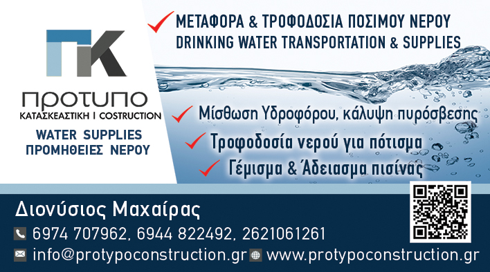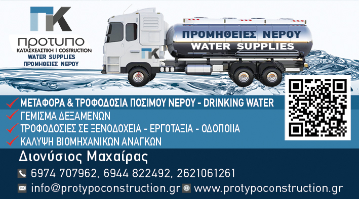 H «ΠΡΟΤΥΠΟ ΚΑΤΑΣΚΕΥΑΣΤΙΚΗ» δραστηριοποιείται με εξαιρετικά επιτυχημένη δραστηριότητα και στο χώρο της μεταφοράς πόσιμου νερού με υδροφόρα σον Πύργο αλλά και της ευρύτερης περιοχής της Δυτικής Ελλάδας.